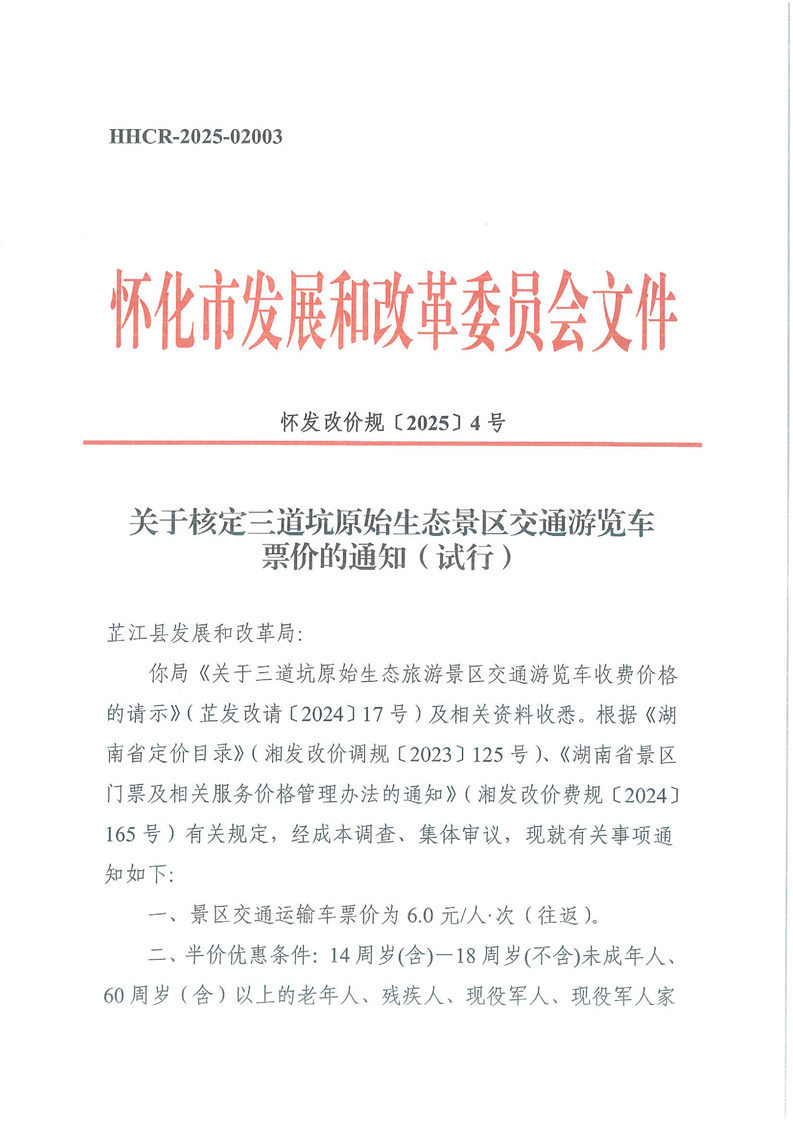 關(guān)于核定三道坑原始生態(tài)景區(qū)交通游覽車票價(jià)的通知(試行)